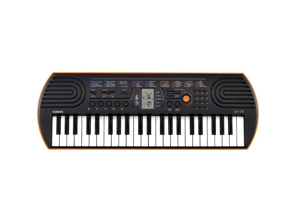 Dětský keyboard SA 76 obsahuje 44 mini kláves 100 zvukových rejstříků, 50 rytmů, 10 demo skladeb s funkcí vypnutí melodie, polyfonie max.. 8 hlasů, 5 bicích padů, LCD displej, dva reproduktory 2 × 1,2 W, napájení: 6 × baterie AA / adaptér AD-E95100 (není součástí), hmotnost: 1,5 kg, rozměry: 604 × 211 × 57 mm, černo-oranžové.