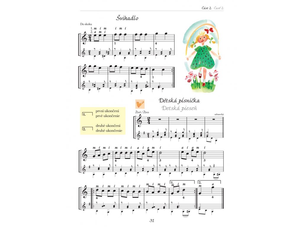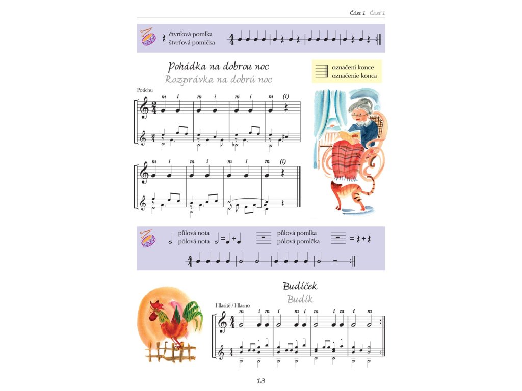 Navíc - noty i slova jsou tištěna ve větší velikosti než je obvyklé a dětem se tak lehčeji a příjemněji čtou. Pro rychlou orientaci v publikaci jsou některá cvičení a skladbičky podbarveny a nechybí ani vysvětlující ikonky.