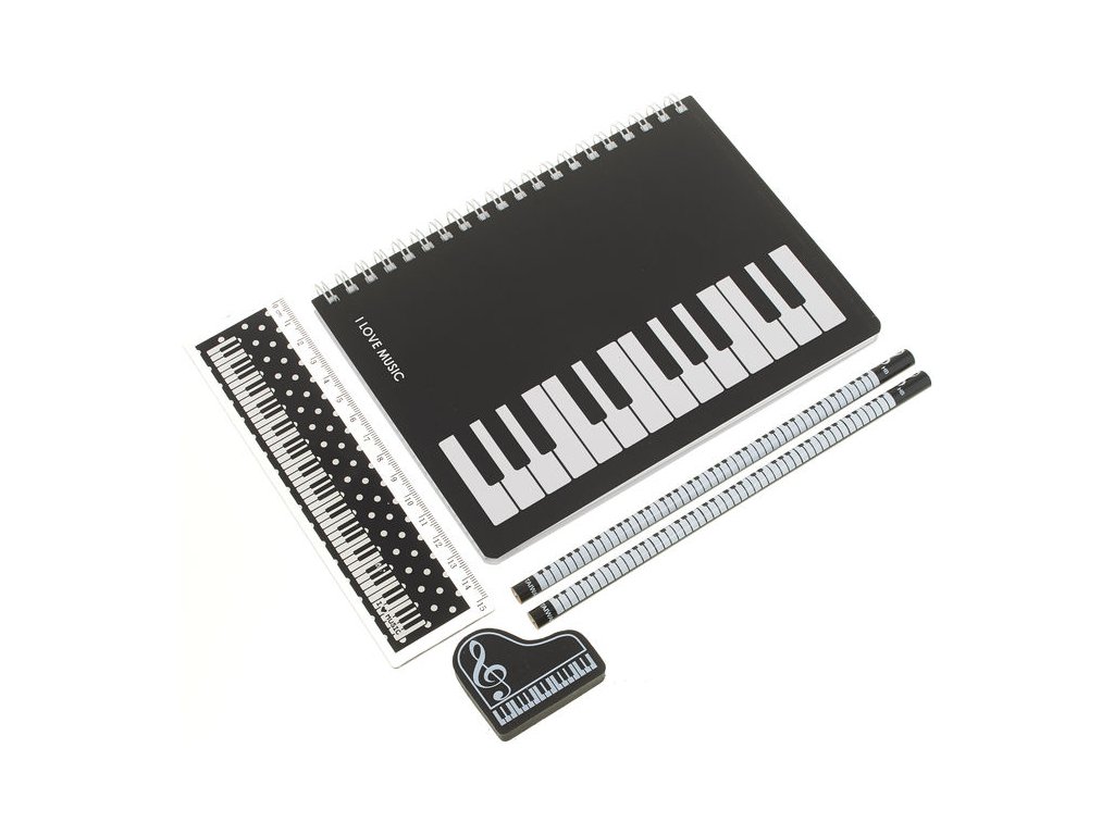 Psací sada (blok, tužky, pravítko, guma ) s hudebním motivem kláves a houslovým klíčem. Vše v uzavíracím plastovém obalu na "zip".